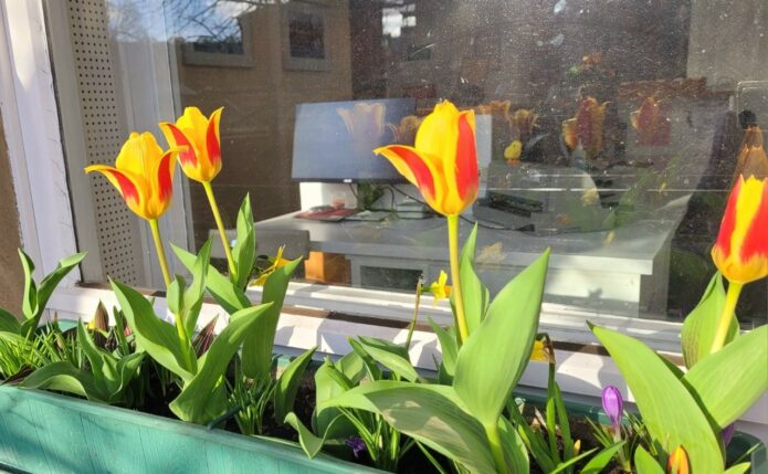 Bäume stehen in voller Blüte und leuchten weiß, gelb und rosa, während in den Beeten viele Frühblüher ihre Köpfe emporstrecken. Auch in unserer Praxis hält der Frühling Einzug: Gelb-rote Tulpen und zarte Narzissen vor den Fenstern sorgen für eine freundliche, lebendige Atmosphäre und bringen ein Stück Frühlingsgefühl in unseren Alltag.